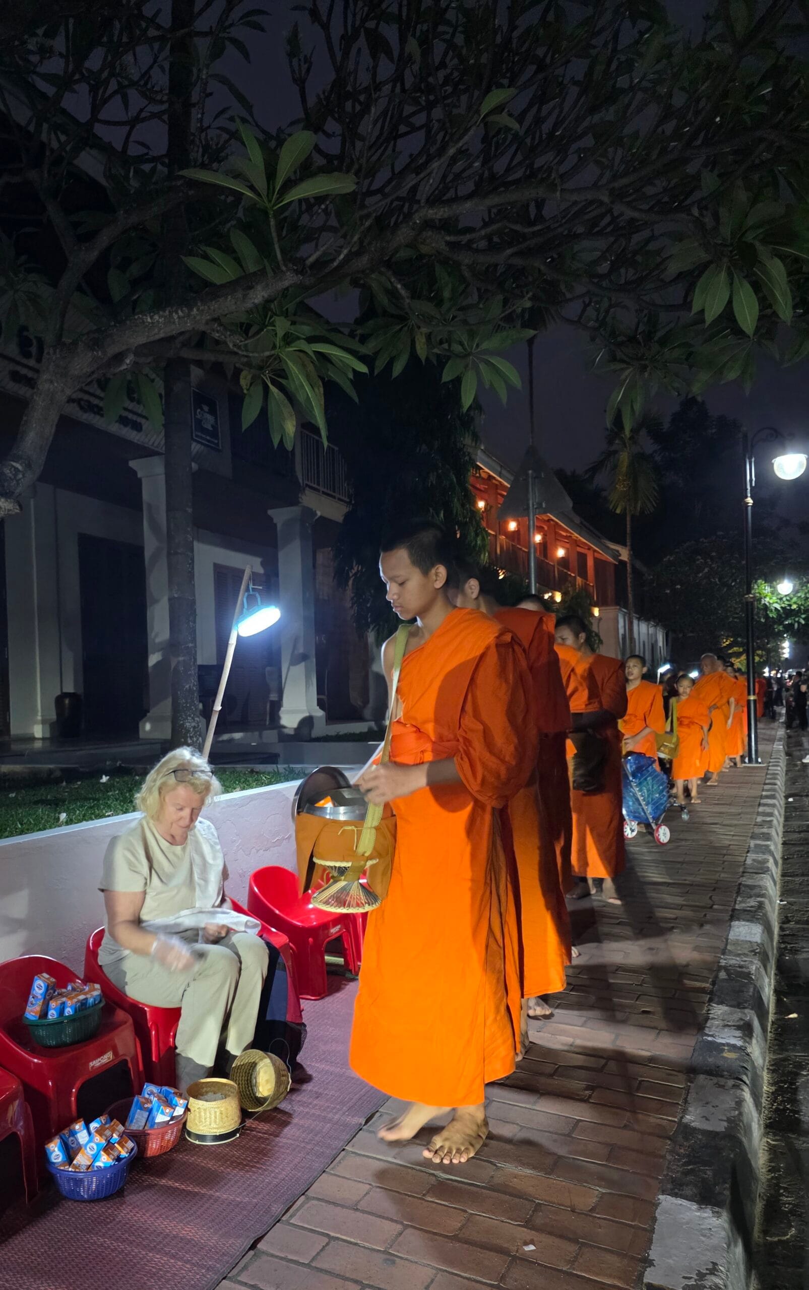So this was me this morning (main pic), up at 4.45am and down at the temple in Luang Prabang for 5.30am when an orderly line of 50/ 60 monks passed me whilst I put either a small ball of sticky rice or carton of milk in to their raffia containers. Nom instructed me not to look at them, smile and strictly not to speak. The same was true for them, although …shhh…one of the elderly monks said “thank you” to me in good English. It seemed a strange transaction without any feeling. I understand that I am to be selflessly generous, but I can’t understand why they can’t show just a ickle bit of gratitude. Nom said that sticky rice was breakfast and lunch in the monastery and then no further food for the rest of the day, only drinks of water, coffee or milk. Many looked painfully thin to me. That’s when I sneaked a look!